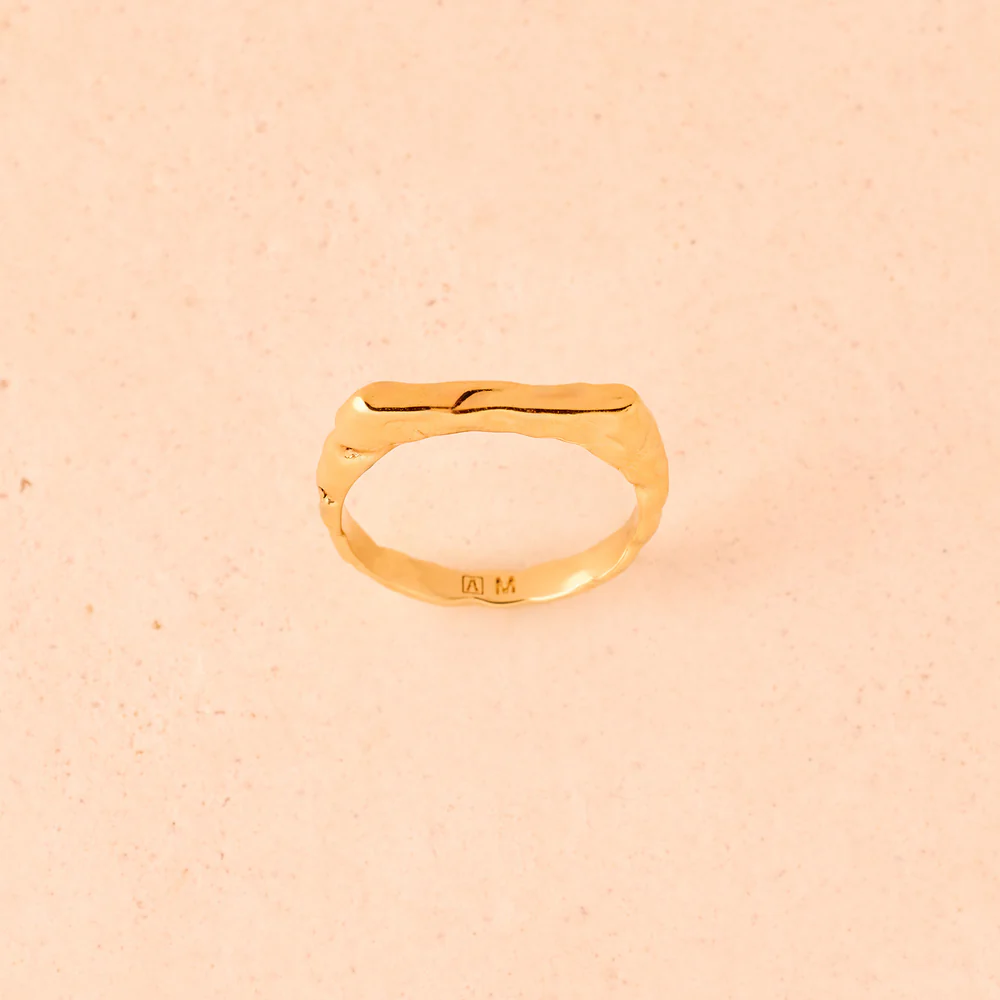 An ancient artifact reimagined, the Octavia mini hammered rectangle signet ring is slim, textured, and minimalist.