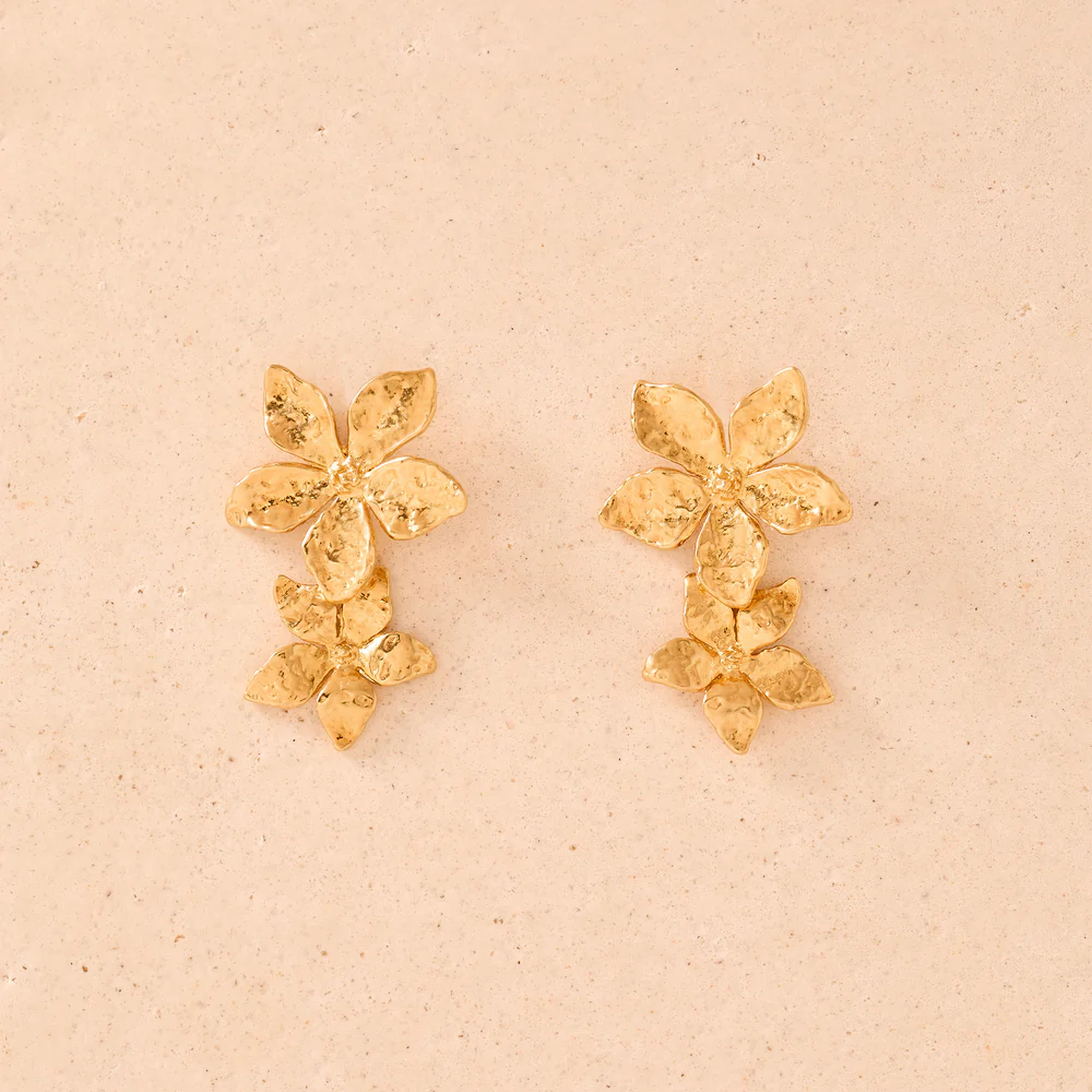 The Thalla floral drop earrings feature two delicately hammered five-petal flower pendants with meticulous details.